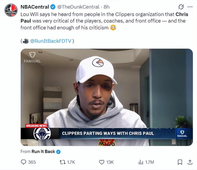 前快船球员路威称自己从快船内部得知的消息是:克里斯-保罗对队友、教练、管理层都颇有微词,而管理层已经无法忍受保罗的那些批评了。