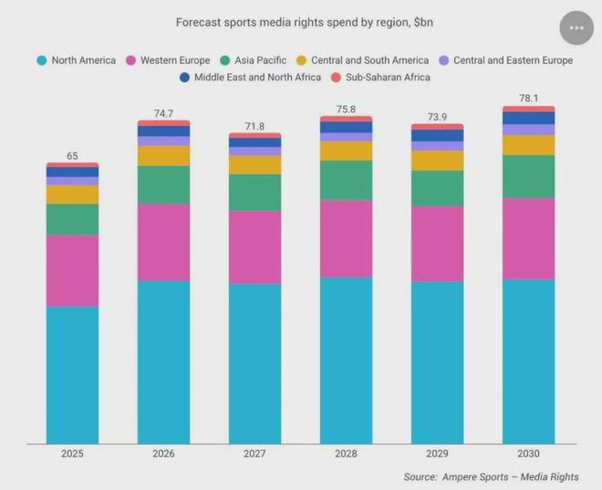 支撑这一预测的基础来自北美市场,自2025-26赛季开始,迪士尼旗下的ESPN和AT&T每年合计为NBA版权支付27亿美元,而2029年MLB也将开启新的转播周期,苹果预期将加入争夺新周期MLB的流媒体版权,涨价几乎板上钉钉。此外,普遍被认为价值低估的NFL在2026年也有望开启新周期版权谈判,达成一份更高价值的转播协议也是市场预期的结果。Ampere在报告中预测,北美将从2025年的318亿增长至2030年的380亿美元,占据全球总预计增幅的47.7%。
