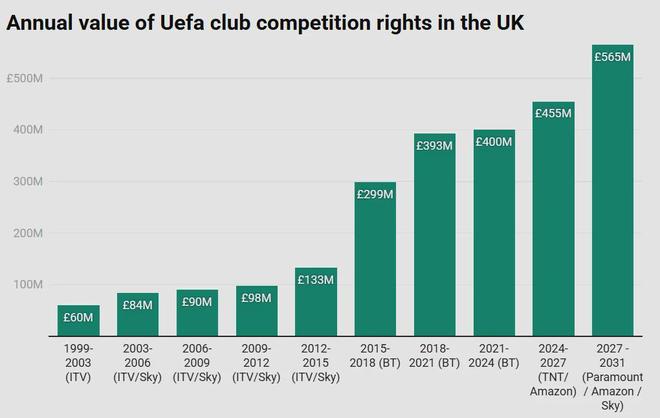 欧足联俱乐部赛事英国版权年均价值变化
