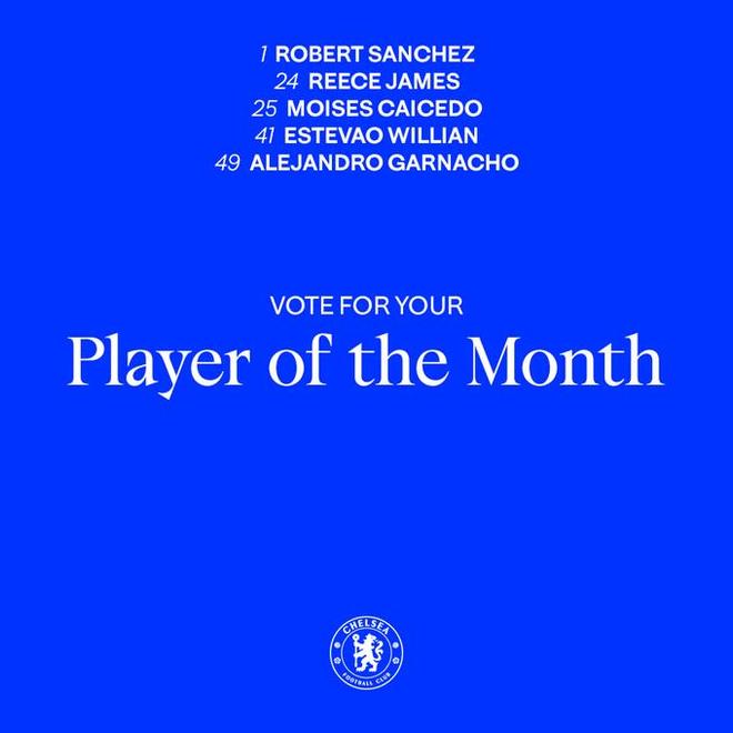 北京时间12月5日,切尔西官方公布了队内11月最佳球员候选名单,这5名球员为桑切斯、詹姆斯、凯塞多、埃斯特旺、加纳乔。